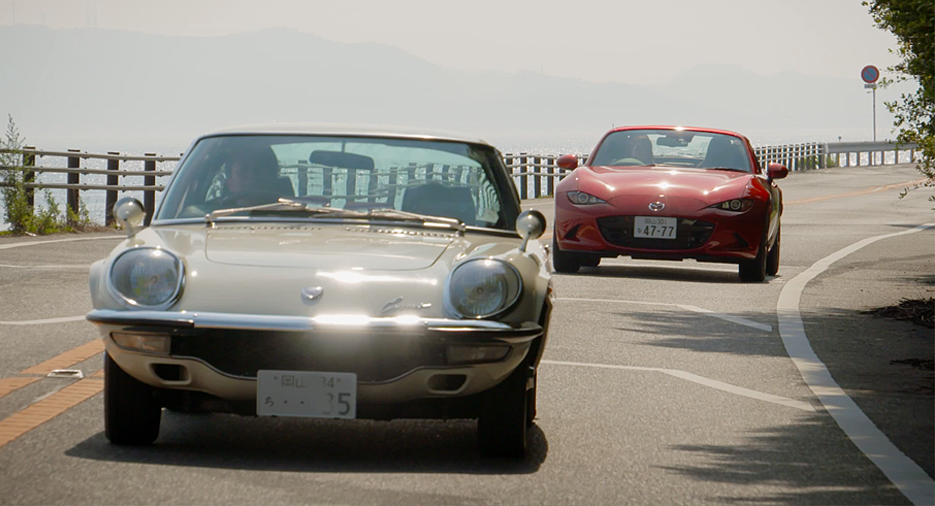 マツダの往年の名車「コスモスポーツ」と、現在の「ロードスター」が岡山の渋川海岸沿いを並走。