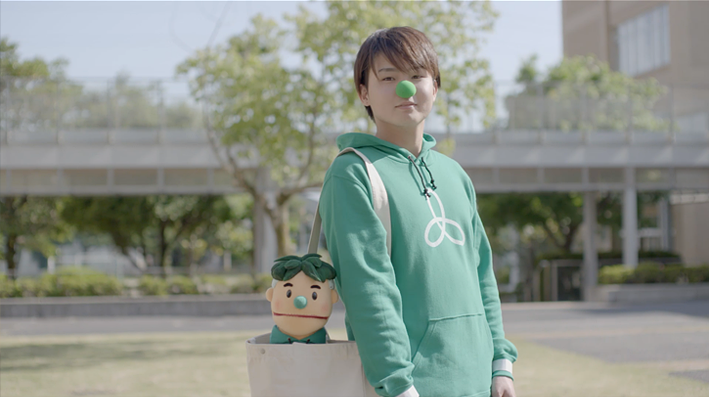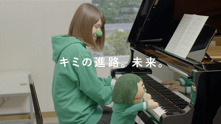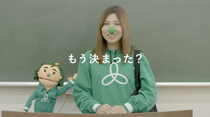 。大学の目印としてつくったキャラクターと大学のシンボルカラーが印象に残るよう心がけました。キャラを模した出演者は学生のみなさんです。