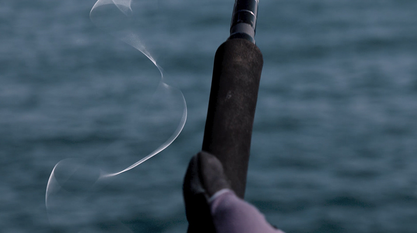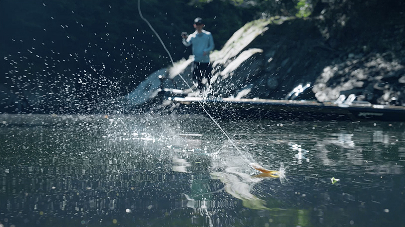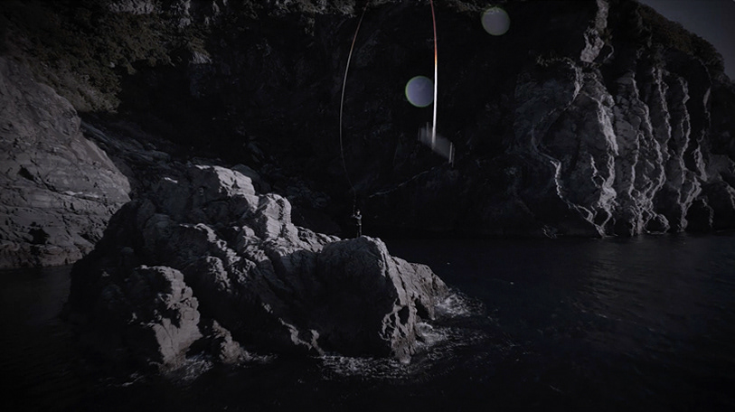 最後、険しい岸壁からキャスティングされる釣り糸は一発撮りです。釣り糸の動きに合わせてドローンが高速で動き、見事な軌道を捉えています。