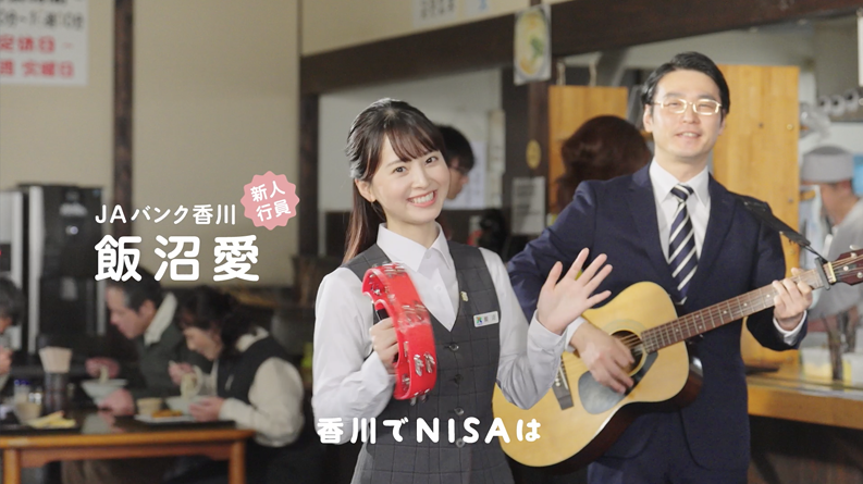2024年度に続いて、2025年度も企画とコピーで参加しました。高松市出身の女優、飯沼愛さんのシリーズです。今回はJAバンク香川の新人行員に扮した飯沼愛さんが地元の飯野山、うどん屋、JAバンク香川の店舗にて香川県民と触れ合います。