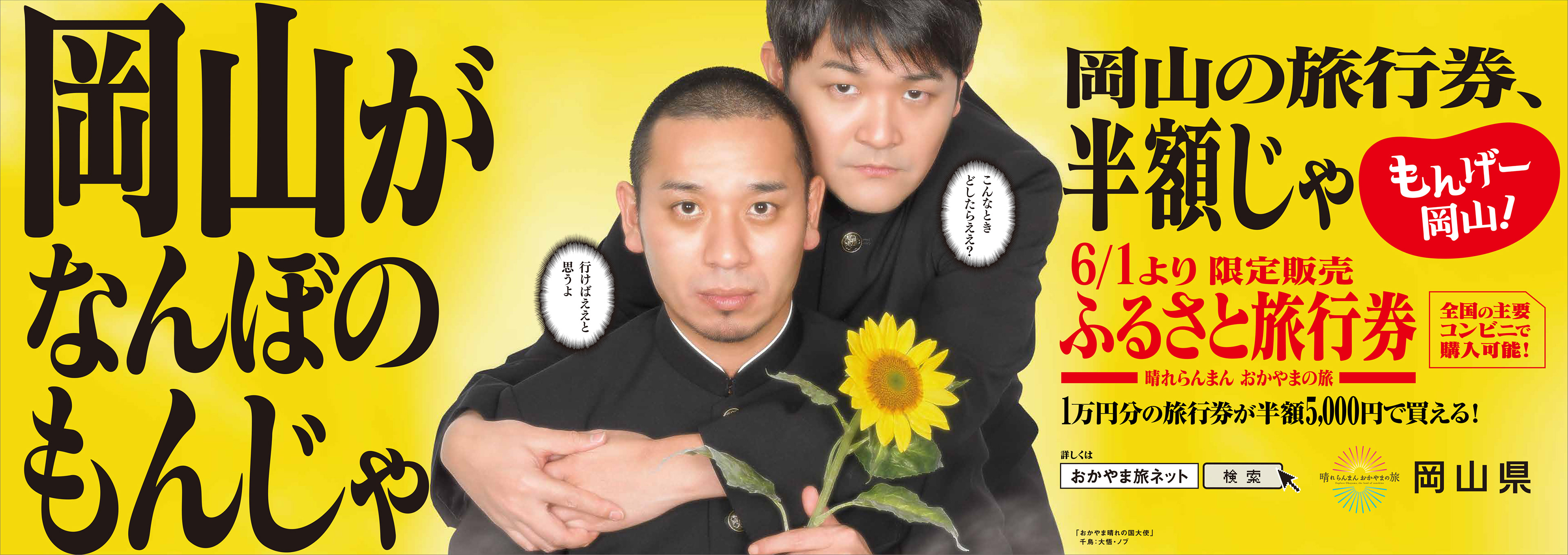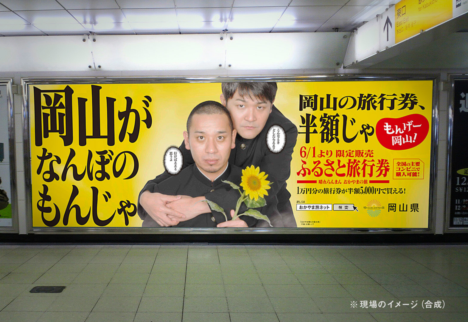 「岡山がなんぼのもんじゃ」 ということで、岡山への旅がお得になる「ふるさと旅行券」の広告です。「もんげー岡山!」キャンペーンにも出演してもらった千鳥を起用して、企画・コピーを担当しました。大阪駅の地下で大型看板や柱巻きなどを使ってのアピールです。ふるさと旅行券は一気に完売したようです。