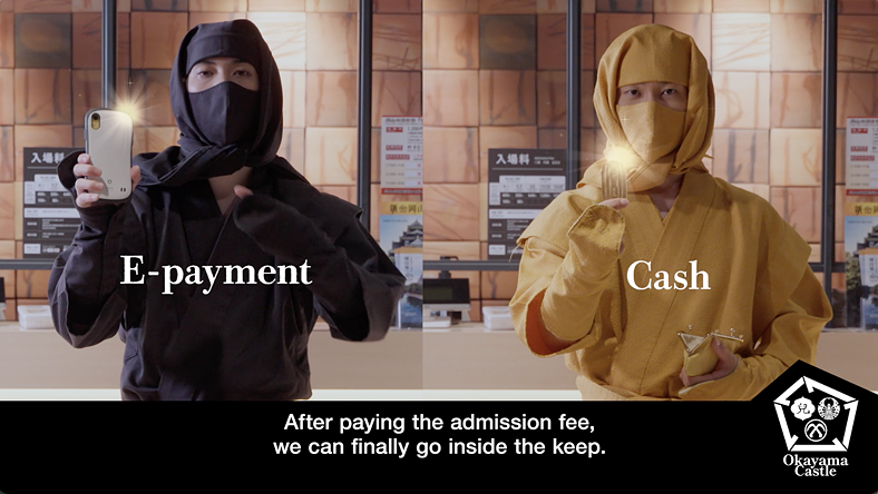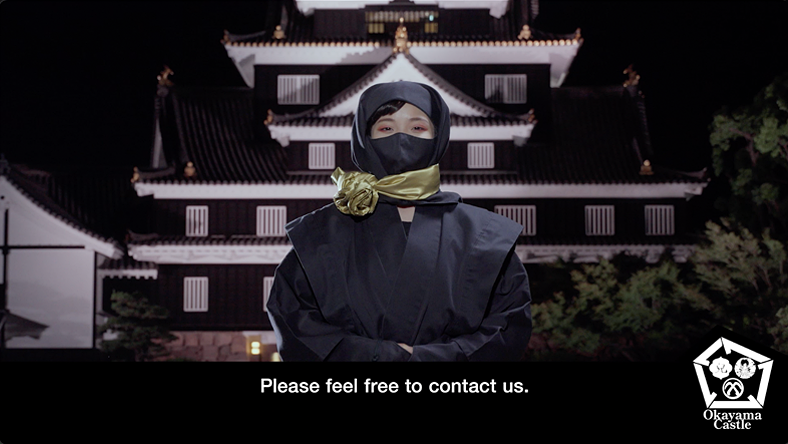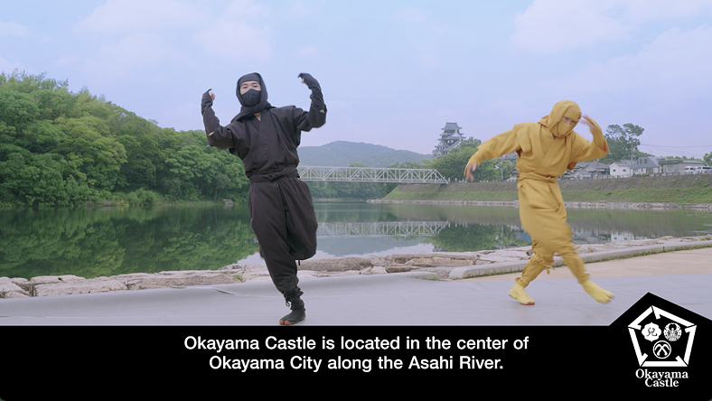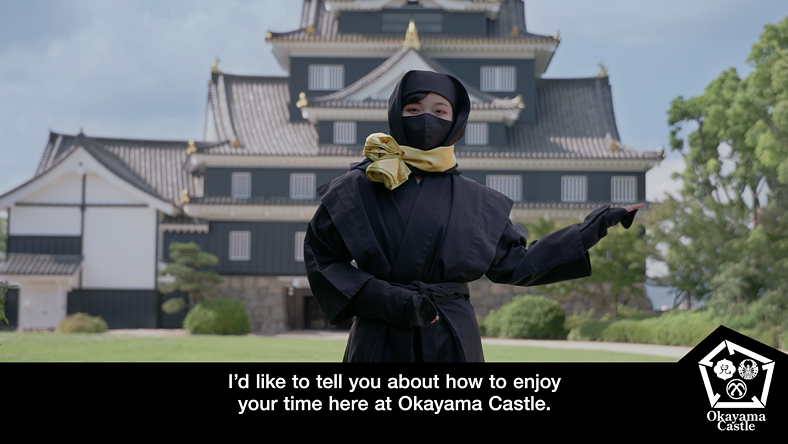 岡山城のインバウンド向けPR動画です。ガイドは女性の忍者(くのいち)が務め、航空会社の機内安全ビデオ風のテイストで岡山城を案内します。おなじみの金色忍者・黒色忍者の躍動感も見ものです。